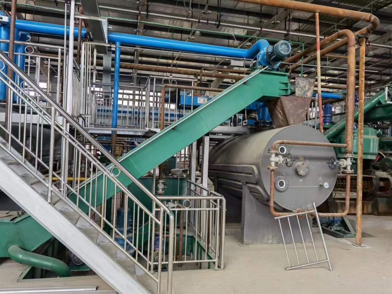 層蝶式汽提塔是國內浸出油廠使用較多的一種汽提設備。若按照水蒸氣對混合油的汽提次數,層蝶式汽提塔可分為單段式和雙段式兩種。雙段蝶式汽提塔,它主要有頂蓋、上塔體、中塔體、下塔體以及底蓋所組成。在上塔體和下塔體內各有6-9組碟盤。每組碟盤都由滯流盤、錐形分配碟和環形分配碟組成。上、下塔體的外殼均裝有夾套,在夾套中通入343-441kPa的加熱蒸汽對塔內的混合油進行間接加熱。中塔體和底盤內各有一組直接蒸汽噴入裝置。這組裝置由集油盤、導流管、中心管、直接蒸汽噴管組成。來自第二蒸發器的混合油,進入層蝶式汽提塔的進油管之后,自上而下逐次流經每一組碟盤。到達中塔體的集油盤底的阻攔,被汽提出的溶劑蒸汽和水蒸氣繞過集油盤向上移動,而油被阻留落下。之后,混合油又沿著下塔體內的各組碟盤逐次流下,到達底蓋內,在直接蒸汽噴入裝置中又一次被汽提,汽提出的溶劑蒸汽和水蒸氣自下而上逐級通過每一組碟盤的空隙,與碟盤表面流下的液膜狀混合油充分接觸,使混合油得到進一步汽提。到達頂部的混合蒸汽通過出氣管進入汽提冷凝器。經汽提后的浸出毛油從底部的出油管通過液封裝置排出。層蝶式汽提塔結構較為簡單,操作方便,工藝效果好。但是必須注意的:每一組碟盤的制造質量和是否水平安裝,將影響混合油液膜的形成與氣液相接觸的面積;直接蒸汽含水,會造成毛油中磷脂的析出;直接蒸汽壓力過高或者用量過大,會形成液泛現象;混合油中含雜太多,則使汽提塔碟盤表面的結垢現象嚴重,毛油質量降低;若采用多段式,應使上層直接蒸汽壓力低于下層。直接蒸汽好采用低壓過熱蒸汽。層蝶式汽提塔在檢修時碟盤的清理比較麻煩。